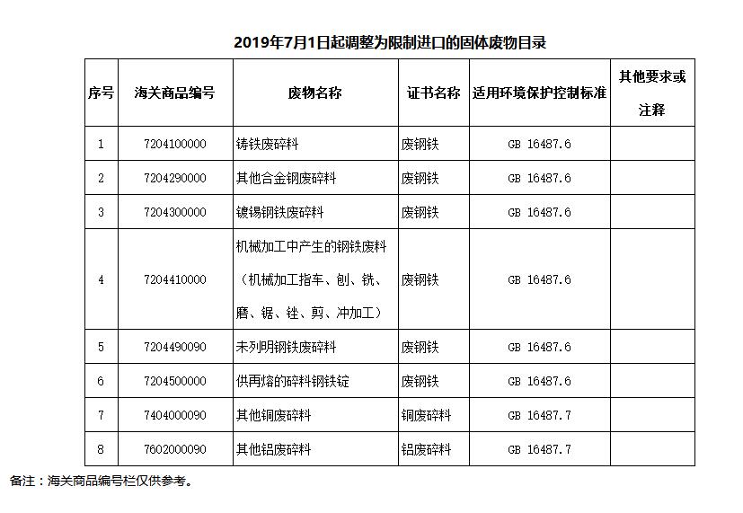 將廢鋼鐵、銅廢碎料、鋁廢碎料等8個(gè)品種固體廢物(見附件),從《非限制進(jìn)口類可用作原料的固體廢物目錄》調(diào)入《限制進(jìn)口類可用作原料的固體廢物目錄》,自2019年7月1日起執(zhí)行。