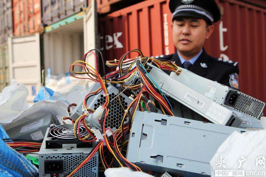 記者在銷毀現(xiàn)場看到,這批“洋垃圾”主要為廢舊電腦,電腦表面布滿了灰塵,硬盤等主要零部件已在入境前被取走。